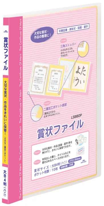 【賞状や作品をキレイに保管】 ・B4判サイズの賞状や作品を綺麗に保管 ・ポケット底部は破れにくい二重構造 ・小さいサイズでも綺麗に収納できる三角ストッパー20片付き ・収納枚数20枚