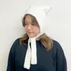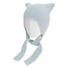 かぶると猫耳のように耳が立つニット帽。アクリルタッチなナイロン素材。紐はリボンで結んでもそのまま垂らしても◎