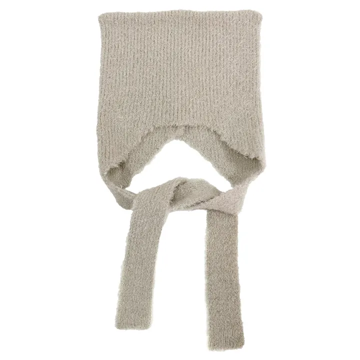 かぶると猫耳のように耳が立つニット帽。アクリルタッチなナイロン素材。紐はリボンで結んでもそのまま垂らしても◎