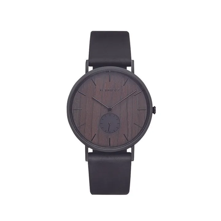 文字盤に木材を採用したメンズコレクション「FRITZ」。6時位置にスモールセコンドを配したシンプルなデザインが程よい個性を演出します。このモデルはダークウッドを採用しています。