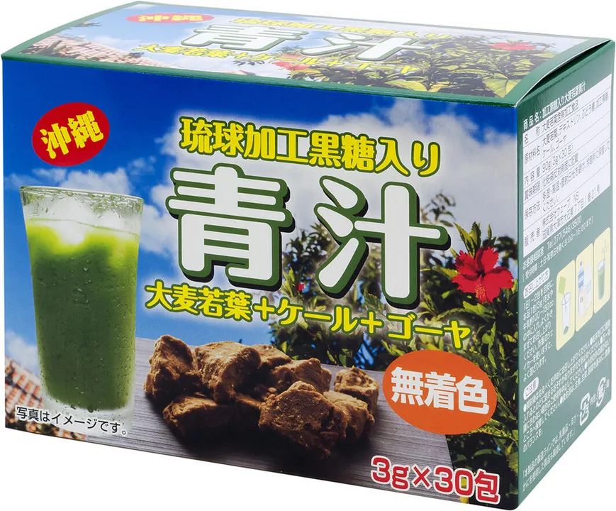 栄養たっぷりの土壌で育った大麦若葉を使用し、野菜の王様といわれる「ケール」、栄養価の高い「ゴーヤ」をブレンド。さらには、沖縄産の黒糖を加え、野菜が苦手な方やお子様にも美味しく飲んでいただけるように仕上げました。食品としても人気があり、生野菜に比べて簡単に手軽に栄養を摂取できるなどの利点で評価も高い商品です。                           (お召し上がり方)1日1~2包を目安に、本品1包(3g)を水や牛乳約100~150ccの中に入れ、よくかき混ぜてお召し上がりください。市販のシェーカーを使いますと、よく混ざります。