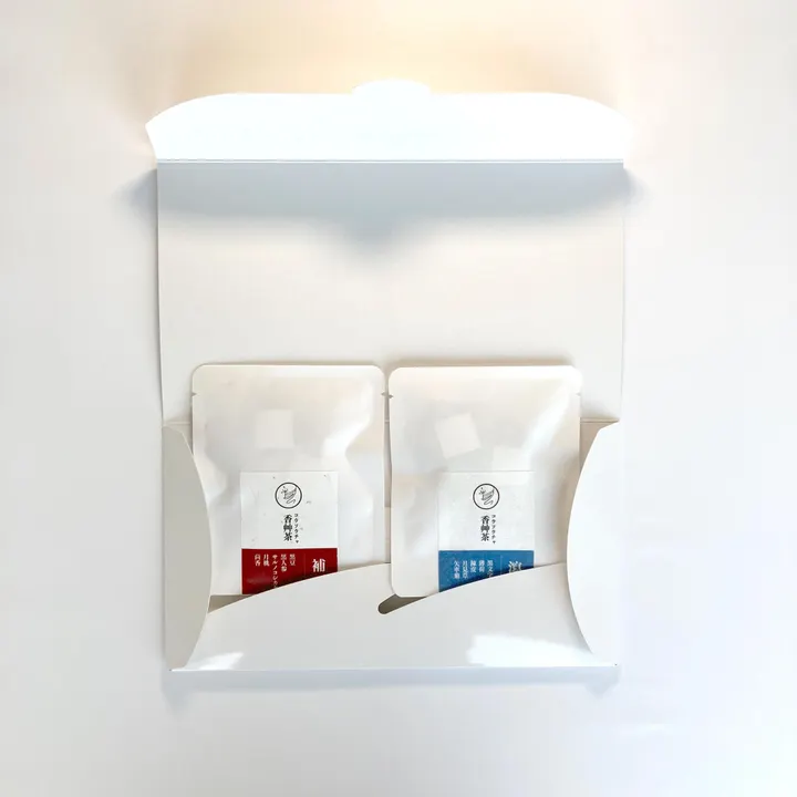香艸茶 補 -ホ- と 瀉 -シャ- の小袋セットです。 まずは飲み比べをしてみたい方や、ちょっとした手土産、プレゼントにもご利用いただけます。 【 香艸茶 補 -ホ- 】 ────────────── 黒の恵みが心身を研ぎ澄まし、 凛とした強さを育む一杯。 ────────────── 大地に根を張る黒豆と黒人参と、 大自然に生ずサルノコシカケが、 体の奥に眠る力を静かに呼び覚まし、 澄んだ巡りをもたらす。 月桃の凛とした香りが 余分なものを払い、 茴香のやわらかな辛みが きりりと呼吸を整える。 まるで夜空を映す泉のように、 深く澄んだ力を宿すブレンドです。 【 香艸茶 瀉 -シャ- 】 ──────────────  爽やかな風に抱かれ、    心まで澄みわたる一杯 ────────────── 黒文字の 凛とした香りが静けさを与え、 薄荷の 清涼が風のように巡りを通す。 陳皮のやわらかな温かさと 月見草の静かな力が、 心身を内から整え、軽やかに満たしていく。 矢車菊の青が夜明けを思わせ、 澄んだ空気をまとうような清らかなひとときへ。 澄み渡る風が、 忙しい心を爽やかにほどいていくようなブレンドです。