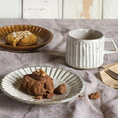 光のあたり具合で、削ぎの風合いが美しくかわり、手作りによる温かみが感じられるカップです。 手にとって質感を感じたくなる器です。 カップ・ソーサー(5寸皿)は別売りとなりますが、 カップ&ソーサー(5寸皿)としてセットでお使い頂けます。 ソーサーはデザート皿としてカップとお揃いでお使い頂いても良いですね! それぞれ粉引き(白)とアメ釉の2色です。