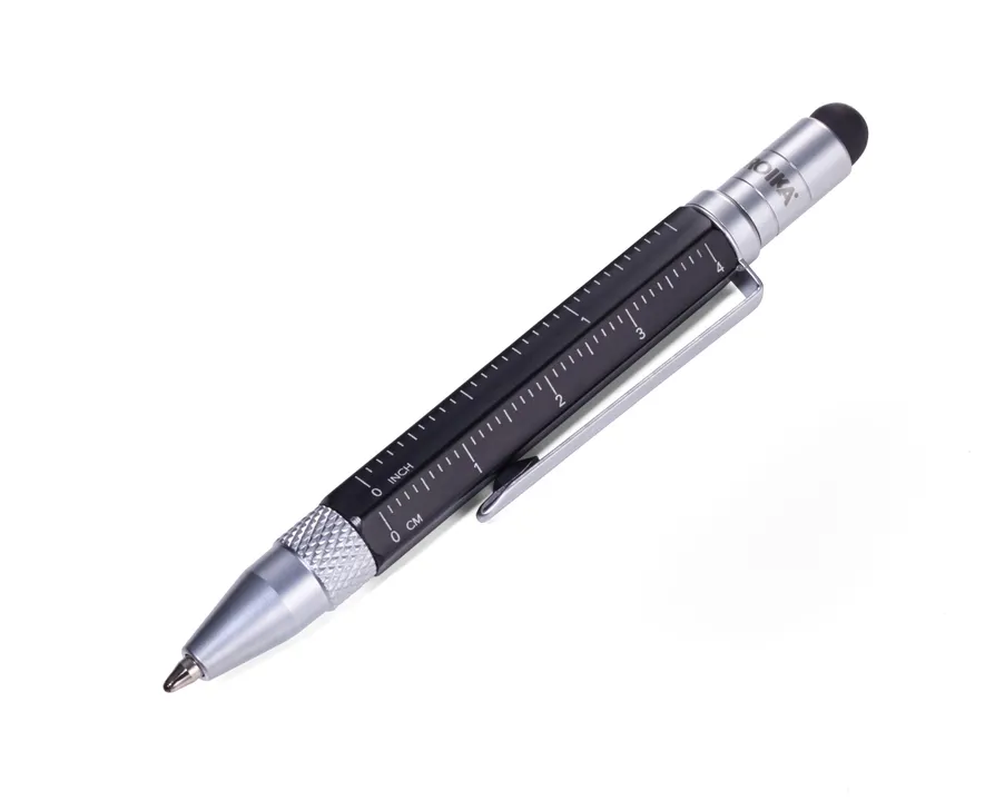 小さなマルチタスクボールペン。小さくても多機能、交換用のリフィルも付いています。機能的なミニボールペンです。 ・定規(センチ) ・ボールペン(油性ブラック) ・静電容量方式のタッチパネルに対応したスタイラス ・+- ドライバー