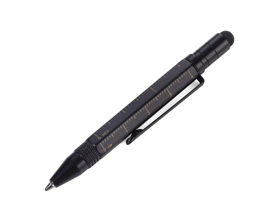 小さなマルチタスクボールペン。小さくても多機能、交換用のリフィルも付いています。機能的なミニボールペンです。 ・定規(センチ) ・ボールペン(油性ブラック) ・静電容量方式のタッチパネルに対応したスタイラス ・+- ドライバー