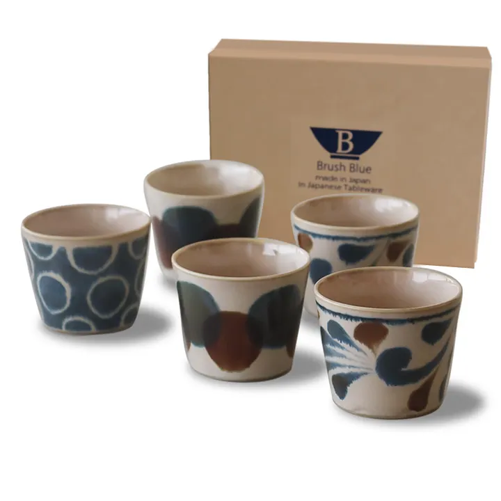 藍色と手描きの風合いを楽しむ器、ブラッシュブルー 製造工程において色の濃淡や釉薬の流れ、柄のにじみなど、それぞれが違う出方になるのも特徴です それが個性となり唯一無二のものに 手描きのような質感をお楽しみください 手に持ちやすいそばチョコカップです 蕎麦のお供はもちろん、ちょこっとおかずを入れたり・お茶のみとしてもぴったりなサイズのカップのセットです