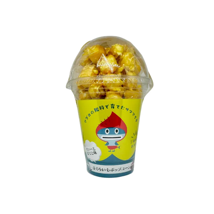 原料:まぐろいも(品種:紅はるか) 三崎マグロを加工する際に捨ててしまう、マグロの骨や皮を堆肥化させ、 当社系列の農業生産法人『ヨコスカアグリファミリー』の畑に撒いて育てたさつまいもを『まぐろいも』と呼んでいます。 このまぐろいもを自社工場でパウダーにし、ポップコーンにしました。 しっかりとさつまいもの風味が感じられ、甘くて美味しいポップコーンはスイートポテト味で子どもから大人まで大人気の商品です。 浜松で有名な『うなぎいも』※うなぎの骨や頭を肥料にし撒いて育てたさつまいも 豊橋の『うずらいも』※うずらの卵のからを肥料にし撒いて育てたさつまいも 第3弾でまぐろいもが誕生しました!!!