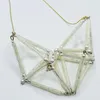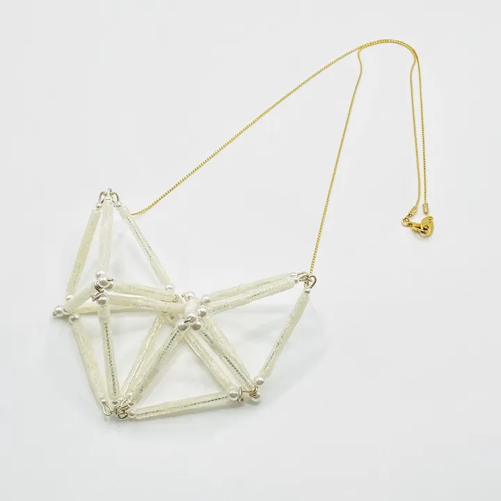テキスタイルシリーズ◯LaceHandkerchief◯ 細長い竹ビーズを不要になったレースハンカチを使用し、一からビーズを作っています 仕上げにコーティングしているので水に濡れても丈夫な仕様となっています 英語を訳すと[三次元ハートネックレス] こちらのネックレスは形が変化します 付けるとハート型になり 動いたり、歩いたりするとハートの形も変化します そういった変化を楽しんで頂ければと思います ⁂mUIk UPCYCLE Story⁂ 衣服の大量生産・大量消費が拡大し、ライフサイクルの短期化によって大量破葉に繋がっているこの現状にファッションが大好きな私にとってとてもショッキングなことでした。 ただ捨ててしまう衣服や残布を私もなりにどうにか再利用することができないか考えた時 出来上がったのがこの作品です。 ほんの少しのことかもしれませんが少しでも持続可能なことに貢献できたら幸いです。