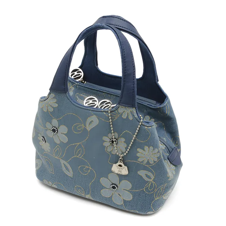 デニム地に花模様をプリントしたハンドバッグ!カジュアルコーディネートにピッタリのデザイン☆定番の人気デザインは仕切り収納があります♪開口タイプ/ファスナー式■ポケット/ (内側)オープン×1(外側)ファスナー×2