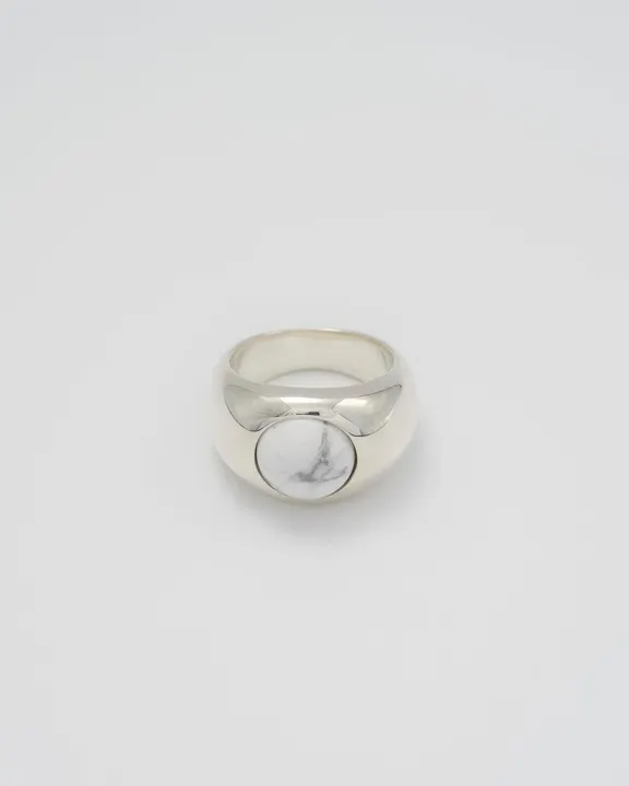 "Stone" series 大理石柄の天然石(ハウライト)をはめ込んだ大振りのシルバーリング。 存在感のあるサイズ感が手元にインパクトを与えます。 「純粋・無垢」を象徴し、高い浄化作用と、鎮静作用に優れた効果をもつハウライト。 冷静さと洞察力を高め、 心身を清らかに保つ効果があるとされています。 ※天然石を使用しているため、石の部分は一つ一つ違う表情を持ちます。