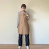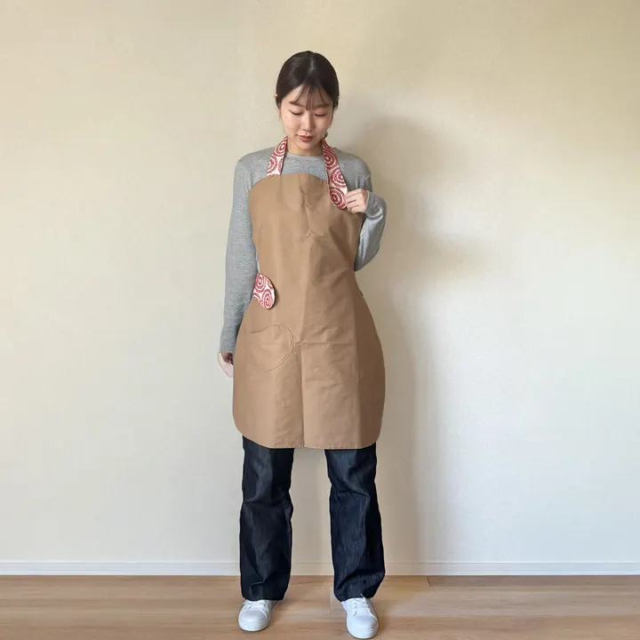 ベージュとカーキのリバーシブルエプロン 撥水加工の生地、カーキとベージュを合わせて どちらもお使い頂けるようにお作りしたリバーシブルエプロン 両面にそら豆形のポケット   首ひもとウエストベルトには 六本木「NUNO」の"切り株・レッド”という名の刺繍が施された布を使うことでモダンな雰囲気 気分に合わせてどちらも使える、楽しい!使いやすい!を形にした pinopinaならではのエプロンです。