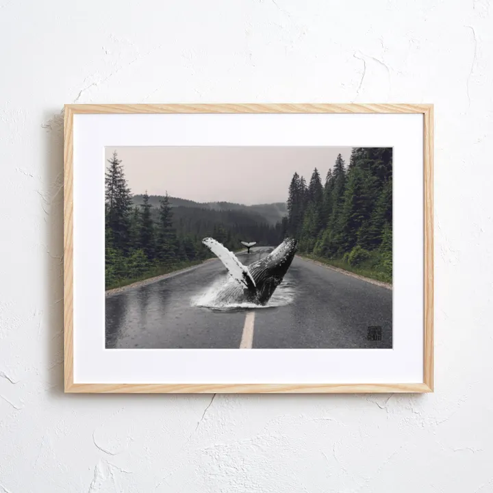 【現代アートポスター】 鯨 クジラ 海 動物 モノトーン モノクロ 道路 写真コラージュ A4(S) フレームセット:無垢 30.4×39.4cm