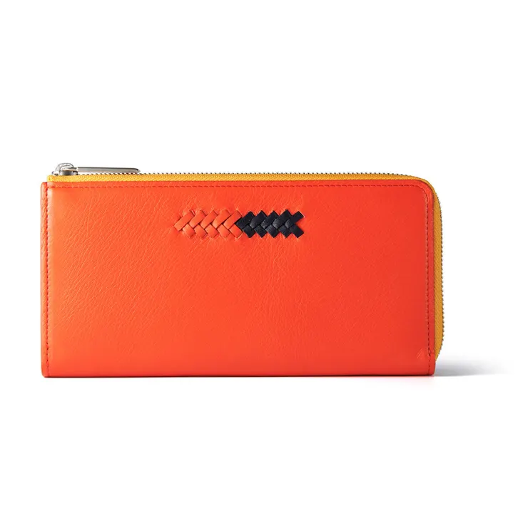 ーーーオリジナル編み込みモチーフが特徴のL字ファスナーラウンド長財布 太陽に照らされた浅瀬の水面の反射を表現したモチーフがアクセントのL字ファスナーラウンド長財布。ユニセックスなデザインなので、性別や年代を問わずお使いいただけます。 スマートな作りですが、収納力抜群です。 ーーーお財布の機能について オープンポケットが真ん中に1か所、オープンポケットの横がマチ付きのお札入れになります。左右にそれぞれカード入れ×6、合計12枚収納でき、カード入れの裏にはフリーポケットを装備。 ーーー素材について 軽く手になじむ国産牛革スムースを使用。軽さとすべすべとした滑らかな手触りを感じながらお使い頂けるのが魅力です。経年変化は比較的にゆっくりなので、綺麗な状態で長くお使いいただけます。 L字になっているファスナーはYKKエクセラファスナーを使用しているので、動きも滑らか。 ーーーブランドBOX入りでギフトにも最適 いつも頑張っている自分へのご褒美として、または大切な方への贈り物としても。 商品は一つ一つブランドBOXにお入れいたします。 ーーアイテム詳細 [サイズ] H:97 W:194 D:21 [機能] カード×12 オープン式コインポケット×1 フリーポケット×2 札入れマチ付きポケット×2  ファスナー×1(YKKエクセラファスナー) [カラー] オレンジ/ネイビーブルー ※掲載商品の色味は出来る限り実物の色味に近づけておりますが、ご利用のパソコン、スマートフォン、モニター環境によって、画像の色味が異なって見える場合がございます。予めご了承下さいませ。 [素材] 国産牛革スムース/ナイロン