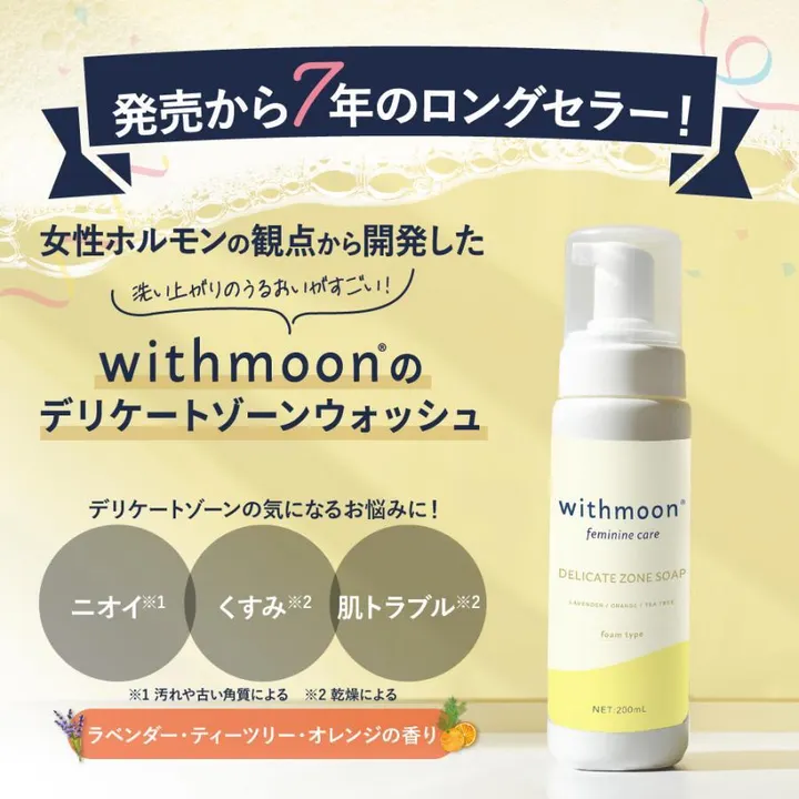 【withmoon】はじめてのフェムケアに。低刺激なデリケートゾーン専用ソープ 生理によりそう「withmoon」のデリケートゾーンソープシリーズです。生理中の気になる匂い対策や、乾燥によるかゆみ、黒ずみの悩みなど、繊細な部位を優しく洗い上げ、健やかに保ちます。 <商品の主な特徴> ・肌に優しい弱酸性&低刺激 デリケートな部位と同じ弱酸性ボディソープ。敏感肌の方はもちろん、初潮を迎えたばかりの子供用(はじめてのデリケートゾーンケア)としても安心してお使いいただけます。 選べるラインナップと利便性 毎日のケアに便利な液体タイプに加え泡タイプをご用意。お試しタイプは持ち運びにもおすすめです。 40代のデリケートゾーンの悩みから、VIOソープを初めて手に取る若い世代まで、幅広く支持される実力派アイテム。自分へのご褒美にはもちろん、彼女へのプレゼントやフェムケアの入門ギフトとしても喜ばれます。 ※当店検索用ワード※ デリケートゾーン 生理 お試し フェムテック フェムケア VIOケア デリケートゾーンケア 女性用 膣ケア 外陰部 腟内フローラ 臭い 黒ずみ 石鹸 ニオイ 防臭 消臭 カンジタ 美白