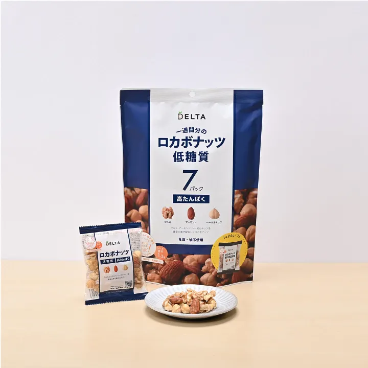 ?1袋あたり30g⇒24gへリニューアルしました?※ナッツの種類や割合に変更はございません。 素焼きしたクルミ・アーモンド・ヘーゼルナッツを独自の黄金比率でミックスしました。 ゆるやかな糖質制限「ロカボ」な食生活を応援するミックスナッツです。油・塩は不使用。 1日1袋一週間で食べきる7袋入り。1袋(24g)あたり糖質1.3g。 ◎マタニティフード協会認定商品◎ 【ロカボナッツってなに?】 ロカボとは低糖質食のこと。良質な資質はたくさん摂取し、糖質を適正に摂取する食事です。ロカボナッツはヨーロッパで行われた研究を参考として当社が栄養バランスを考え独自に配合した黄金比率のミックスナッツです。食物繊維、オメガ3(n-3系脂肪酸)、鉄、亜鉛、ビタミンEをたっぷり含みます。 毎日のおやつ時間に、お弁当のお供に。1袋食べきりの個包装なので、ついつい食べすぎてしまうことも防ぐことができます。
