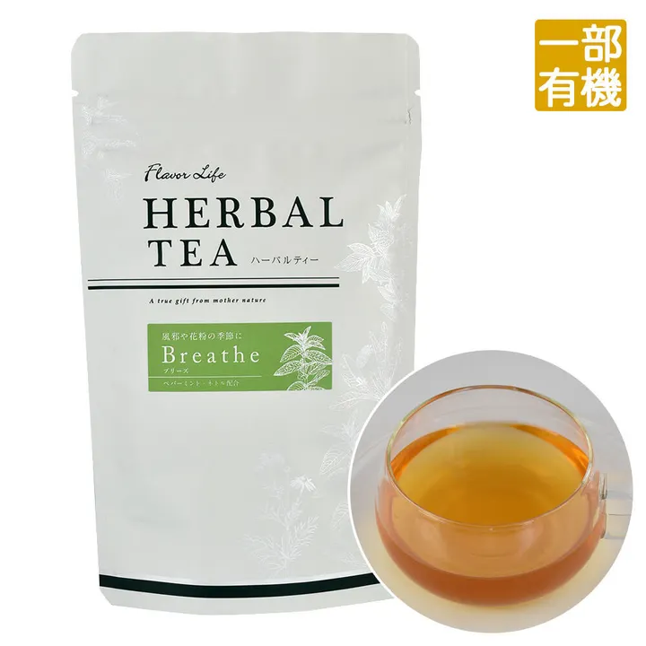 フレーバーライフが監修したオリジナルブレンドハーブティー全7種類。 美味しく飲みやすい味わいにこだわりました。 それぞれのライフスタイルに合わせてお選びいただけます。 ティーバッグ式でハーブティーが簡単に楽しめます。 サイズは、8TB入りと50TB入りから選べます。 ❶Beauty/ビューティー  天然のビタミンCを含むローズヒップとハイビスカスを配合。  甘酸っぱい味わいで、はちみつ等で甘みをつけても美味しく召し上がれます。  <ブレンド内容>有機ローズヒップ、有機ハイビスカス、有機リコリス、ローズレッド ❷Body Shape/ボディシェイプ  黒豆ポリフェノールをたっぷり含んだ黒豆をベースに、  ダンディライオン、チコリを配合した、香ばしくお食事によく合う味わいです。  疲れを感じたときにも試していただきたいブレンドです。授乳期のママにもおすすめ。  <ブレンド内容>  黒豆、有機ダンディライオン、チコリ、ごぼう、有機ジュニパーベリー、有機フェンネル ❸Woman’s Balance/ウーマンズバランス   ルイボスをベースに、女性のバイオリズムをサポートしてくれるラズベリーリーフを配合。  口当たりがよくさっぱりとした味わいです。妊産婦、授乳期のママにもおすすめ。  <ブレンド内容>  有機ルイボス、有機ローズヒップ、有機フェンネル、有機リコリス、有機ラズベリーリーフ、  ストロベリーリーフ ➍Relax Sleep/リラックススリープ  気分を落ち着かせてくれるカモミールとリンデンを配合し、ほんのり甘く優しい味わいです。  お休み前は、ミルクティーにしてもおすすめ。  <ブレンド内容>  有機カモミール、有機レモングラス、オレンジピール、有機リコリス、有機リンデン ❺Warm/ウォーム  スパイシーなジンジャーとオレンジピールを配合し、心と体をほっとさせてくれます。  シトラスジンジャーのスパイシーな甘い味わいです。食欲が出ないときにもおすすめ。  <ブレンド内容>  有機ルイボス、ジンジャー、有機レモングラス、有機リコリス、オレンジピール ❻Breathe/ブリーズ  ペパーミントベースに甜茶、ネトルを配合し、風邪や花粉の気になる季節におすすめ。  メントールのすっきりとした風味で、喉や鼻をさわやかにしてくれます。  気持ちをリフレッシュしたいときにも。  <ブレンド内容>  有機ペパーミント、有機ルイボス、有機ネトル、甜茶、エルダーフラワー ❼Eye Bright/アイブライト  ヨーロッパなどでは古くから目に良いハーブとして知られ「輝く目」を意味する  「アイブライト」を配合したブレンドハーブティー。バタフライピーのコバルトブルーの  色合いが特徴で、レモンを入れると紫色に変化します。爽やかでさっぱりとした味わいです。  <ブレンド内容>  有機レモングラス、バタフライピー、アイブライト、有機フェンネル