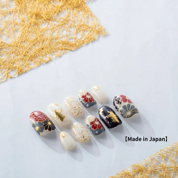 華やかな赤と金色をベースに、繊細な花模様を施した美しい和風ネイルチップです。結婚式や成人式、着物を着る特別なイベントにぴったりで、指先を一層上品に演出します。 和装やドレスにも合わせやすい落ち着いたカラー展開です。 ご自身へのご褒美や、大切な方へのプレゼントにもおすすめです。 LUNAKAのシールを使用して手作業で丁寧に仕上げており、形状記憶チップフレキシーの採用により爪にフィットします。贈り物にもおすすめの逸品です。