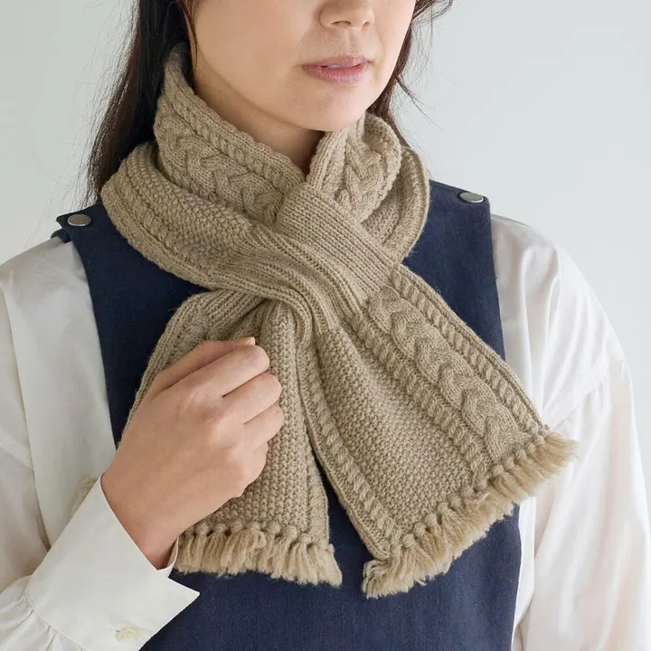 アランと地模様が楽しめるフリンジ付きミニマフラー BE(ベージュ)