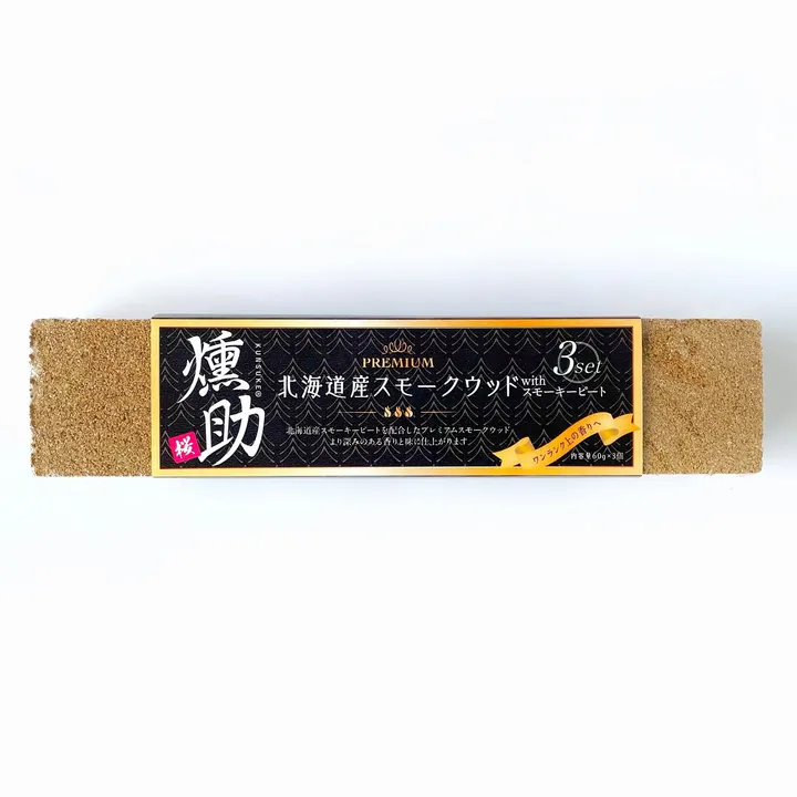ウィスキーの香り付けにも使用される北海道幌延町産のピートを10%配合した特別なスモークウッドは日本初! 蝦夷山桜の甘い薫香に濃厚で力強い深みのある香りが乗ると大変好評です♪ 食材を並べて、スモークウッドに着火するだけの簡単調理で本格的な一品料理に! ------------------------------------------------------------- 【おすすめのポイント】 1.天然蝦夷山桜を使用しているので薬剤など一切噴霧されていなく 安全・安心です! 2.粒の大きさと圧縮を調整し火は消えにくく、誰でも簡単においしい燻製を作ることができます! 3.希少価値の高い蝦夷山桜は他の樹種に比べタール分が少ないので、燻しすぎによる失敗(えぐみ)を防ぎます! 4.ピート入りなのでより薫りが強く、深いコクが味わえます! ------------------------------------------------------------- 【仕様】 ・冷燻や温燻に使います ・お香の様に着火させると煙を出し続けます ・60gで約1時間15分~30分煙を出すことができます。それ以上連続して燻製をする場合はスモークウッドをつなげてお使いいただくと継続して煙を出すことができます ・稀に黒い粒が見られますが、蝦夷山桜の樹皮も粉砕し圧縮しているため問題なくお使いいただけます ・固めるためにマメ科の増粘剤を使用しておりますのでアレルギーのある方はご使用をお控えください 【使用方法】 ・ガスバーナーまたはコンロの火でスモークウッド短側面全体が黒く焦げるくらい燃やします ・スモークウッドの角から少しずつ燃え始め白い灰が出始めると準備完了です(この時スモークウッドから炎が出ている場合は消してください) ・アルミホイルの上に載せて、スモークウッド専用の燻製器内に設置します 【保管上の注意】 ・湿度の高い場所で保管しておりますと、カビが生える原因となります。涼しい場所に保管してください