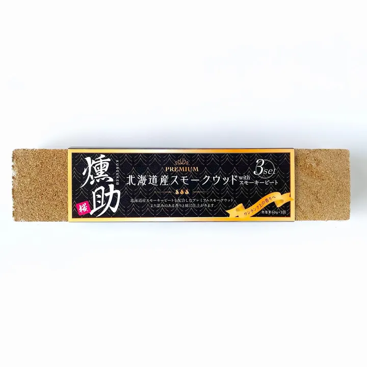 ウィスキーの香り付けにも使用される北海道幌延町産のピートを10%配合した特別なスモークウッドは日本初! 蝦夷山桜の甘い薫香に濃厚で力強い深みのある香りが乗ると大変好評です♪ 食材を並べて、スモークウッドに着火するだけの簡単調理で本格的な一品料理に! ------------------------------------------------------------- 【おすすめのポイント】 1.天然蝦夷山桜を使用しているので薬剤など一切噴霧されていなく 安全・安心です! 2.粒の大きさと圧縮を調整し火は消えにくく、誰でも簡単においしい燻製を作ることができます! 3.希少価値の高い蝦夷山桜は他の樹種に比べタール分が少ないので、燻しすぎによる失敗(えぐみ)を防ぎます! 4.ピート入りなのでより薫りが強く、深いコクが味わえます! ------------------------------------------------------------- 【仕様】 ・冷燻や温燻に使います ・お香の様に着火させると煙を出し続けます ・60gで約1時間15分~30分煙を出すことができます。それ以上連続して燻製をする場合はスモークウッドをつなげてお使いいただくと継続して煙を出すことができます ・稀に黒い粒が見られますが、蝦夷山桜の樹皮も粉砕し圧縮しているため問題なくお使いいただけます ・固めるためにマメ科の増粘剤を使用しておりますのでアレルギーのある方はご使用をお控えください 【使用方法】 ・ガスバーナーまたはコンロの火でスモークウッド短側面全体が黒く焦げるくらい燃やします ・スモークウッドの角から少しずつ燃え始め白い灰が出始めると準備完了です(この時スモークウッドから炎が出ている場合は消してください) ・アルミホイルの上に載せて、スモークウッド専用の燻製器内に設置します 【保管上の注意】 ・湿度の高い場所で保管しておりますと、カビが生える原因となります。涼しい場所に保管してください