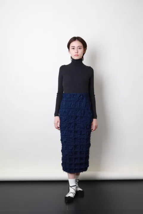 絞りによる素材の大胆さはありつつシンプルなデザインで、どんなシーンでも決まる一枚です。 ストレッチの効いたダンボールニット素材に伝統的な技法”蜘蛛絞り”を格子柄で施しました。 絞りの凹凸が製品のストレッチ性をより高め、ラインはタイトですが着心地の良いスカートです。 裾部分は切りっぱなしの始末になっており、お好みのサイズに格子の升目ごとにカットができます。カットした部分からは糸のほつれなどはなく、カット部分は絞り形状効果で裏側へ隠れます。 格子状の蜘蛛絞りの凹凸は着用した時にボディラインをきれいに見せてくれます。 小さくたたんでもシワが気にならず、ご旅行や出張の多い方にもおすすめ。 ご自宅でのお洗濯も可能です。形状はなくなりません。