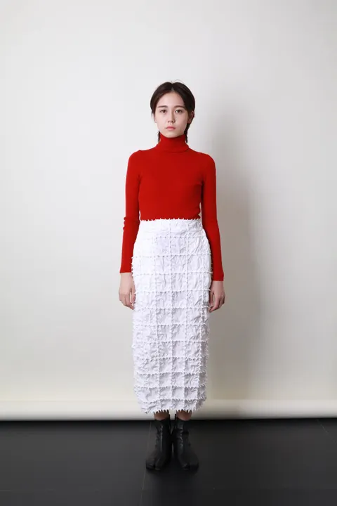 絞りによる素材の大胆さはありつつシンプルなデザインで、どんなシーンでも決まる一枚です。 ストレッチの効いたダンボールニット素材に伝統的な技法”蜘蛛絞り”を格子柄で施しました。 絞りの凹凸が製品のストレッチ性をより高め、ラインはタイトですが着心地の良いスカートです。 裾部分は切りっぱなしの始末になっており、お好みのサイズに格子の升目ごとにカットができます。カットした部分からは糸のほつれなどはなく、カット部分は絞り形状効果で裏側へ隠れます。 格子状の蜘蛛絞りの凹凸は着用した時にボディラインをきれいに見せてくれます。 小さくたたんでもシワが気にならず、ご旅行や出張の多い方にもおすすめ。 ご自宅でのお洗濯も可能です。形状はなくなりません。
