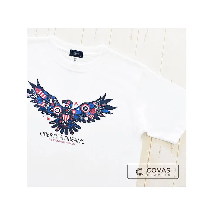 " アメリカンイーグル "  アメリカの象徴イーグルがデザインされたTシャツ。 アメリカの強さや勇敢さを体現している様はまさにTHE USA!。 夢と自由を求めて海を渡るその日のために・・・♪ 綿100% 6.2オンス・ヘビーウエイト天竺生地・コーマ糸使用 プリント方法:ダイレクトインクジェットプリント ★ワンランク上の品質★ ホワイトTシャツは透け感や肌着っぽさを無くするために、 他社でよくある5.6オンスのヘビーウエイト生地ではなく、 ワンランク上の高品質でしっかりした6.2オンス・コーマ糸生地を使用。 衿リブは洗濯を繰り返しても伸びないしっかりした作りになっています。 【XS】 身丈56 身幅42 肩幅38 袖丈15cm  女性小さめ 【S】 身丈62 身幅46 肩幅42 袖丈18cm  女性標準〜大きめ、男性小さめ 【M】 身丈67 身幅51 肩幅47 袖丈21cm  男性標準 【L】 身丈70 身幅55 肩幅50 袖丈22cm  男性大きめ 【XL】 身丈73 身幅58 肩幅54 袖丈23cm  男性特大 ※サイズ表記はメンズサイズの表記になっています。 商品キーワード: アメリカ イーグル 鷲 独立記念日 USA 星条旗 イーグルTシャツ アメリカTシャツ  Tシャツ Tシャツ ティーシャツ メンズ レディース メンズTシャツ レディースTシャツ 大人 ユニセックス 男女兼用 男性 女性 トップス カットソー 半袖カットソー 半袖Tシャツ 半袖T 半袖 カジュアル プレゼント 父の日 クルーネック デザイン デザインTシャツ イラスト イラストTシャツ グラフィック グラフィックTシャツ プリント プリントTシャツ 綿 コットン 綿100% ヘビーウエイト 雑貨店 厚手 人気 おすすめ 数量限定 XS SS LL XL Tシャツブランド コバス コバスグラフィック COVAS GRAPHIC COVASGRAPHIC