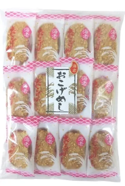 昔ながらの懐かしい味・・・・ 釜戸で炊いたごはんの底には「おこげ」。そんな「おこげ」のようなせんべいです。 海老味のパリッと香ばしい「おこげめし」せんべいです。 リピート率も高い、人気の商品です!!