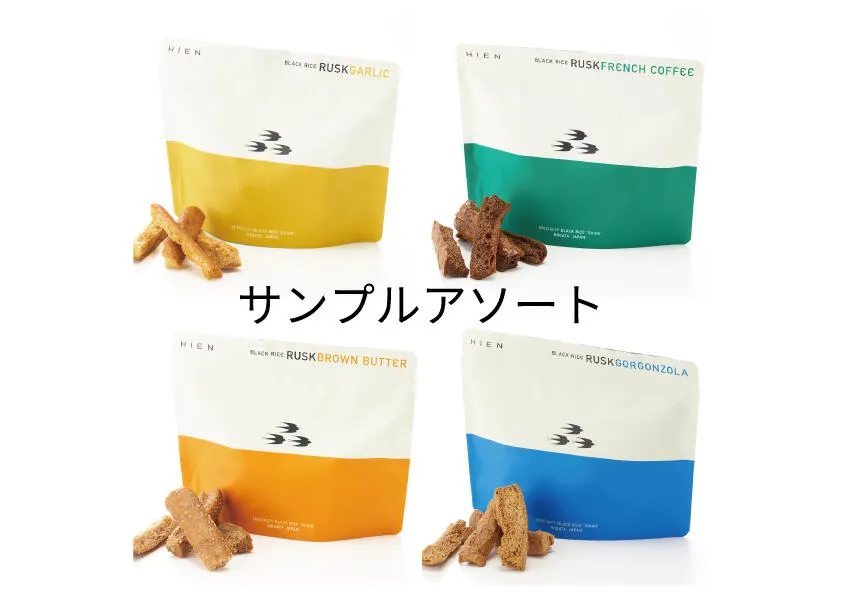 豊富な栄養素を含むお米「紫宝」を原料に、長年にわたるパン製造の技術から生まれた手切りのフランスパンラスク。 4種アソート商品です。 ①焦がしバター:サクサクとした食感と、口に入れた瞬間の芳ばしいバターの香り、優しい甘みをお楽しみください。 ②ゴルゴンゾーラ:サクサクの食感と、濃厚なチーズの風味がクセになる美味しさです。ワインやビールとも相性抜群です。 ③フレンチコーヒー:サクサクの食感と、フランス産のコーヒーがたっぷりとしみこんだほどよい苦みと甘みの調和をお楽しみください。 ④ガーリック:サクサクとした食感と、ガーリックの風味がクセになる美味しさです。ワインやビールとも相性抜群です。