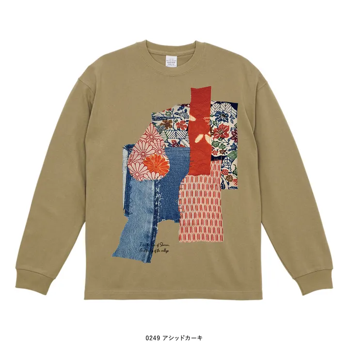 着物アパレルブランドValley’s Lilyの着物とデニムの端切れを使ったスクラップアートをプリントしたオリジナルビックシルエットロングスリーブTシャツです。 ビックシルエットのユニセックスの商品です。 日本の伝統文化の着物を新しいファッション形として楽しんでみませんか?