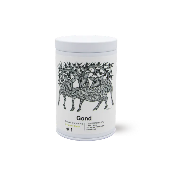 インド中央部に居住する先住民、パルダーン・ゴンド族が描く「ゴンド・アート」 民族画でありながらポップでモダンなテイストを持つゴンド・アートは、近年世界中の美術館で紹介され、日本ではインドの出版社タラブックス社によるシルクスクリーン印刷の手作りの絵本「夜の木」や「世界のはじまり」などで、少しずつ知名度が上がっています。 Tea Shop Parvatiでは、このゴンド・アートの原画を常設展示しており、そのゴンド・アートをイメージした100%ダージリンティーのみのブレンドティーを作りました。 神秘的なモノクロのゴンド・アートの茶缶、飾っておくだけでもステキです。 #1 … 1st Flushをベースにした、若々しい香りと爽やかな後味が心地よいオリジナル・ブレンドティー。 シングルオリジンとは一味違う風味をお楽しみください。 和菓子やドライフルーツとのペアリングも素晴らしいお茶です。 グレード:FTGFOP 内容量:40g(約20杯分)