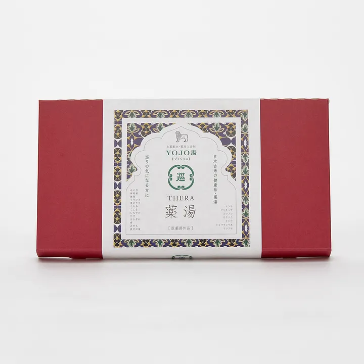THERA初の医薬部外品!!! THERA YOJO(じょじょ)湯  いよいよ、念願の医薬部外品の薬湯が完成しました。 東大寺大湯屋(鉄湯船)、法華寺(光明皇后の浴室)、行基のからふろや霊山寺の薬湯等、漢方や薬草に加えて奈良は”お風呂”の歴史文化のはじまりの地でもあります。当時のお風呂の目的は身を清める禊の為であったり、当時流行した疫病の予防や治療などの養生の為であったとも言われています。ご自宅でも本格的な薬湯を。是非ご体験ください。 THERA YOJO湯 (巡) 生薬配合・薬用入浴剤(医薬部外品) 3包入り 身体が温まる生薬を七種配合。 身体を温めスッキリとリラックス。 【効果・効能】 冷え性、神経痛、腰痛、リウマチ、肩のこり、うちみ、くじき、ひび、あかぎれ、 痔、あせも、疲労回復 【成分】 日局トウキ、日局センキュウ、日局モクツウ、日局チンピ、 日局ショウキョウ末、別紙規格マツブサ