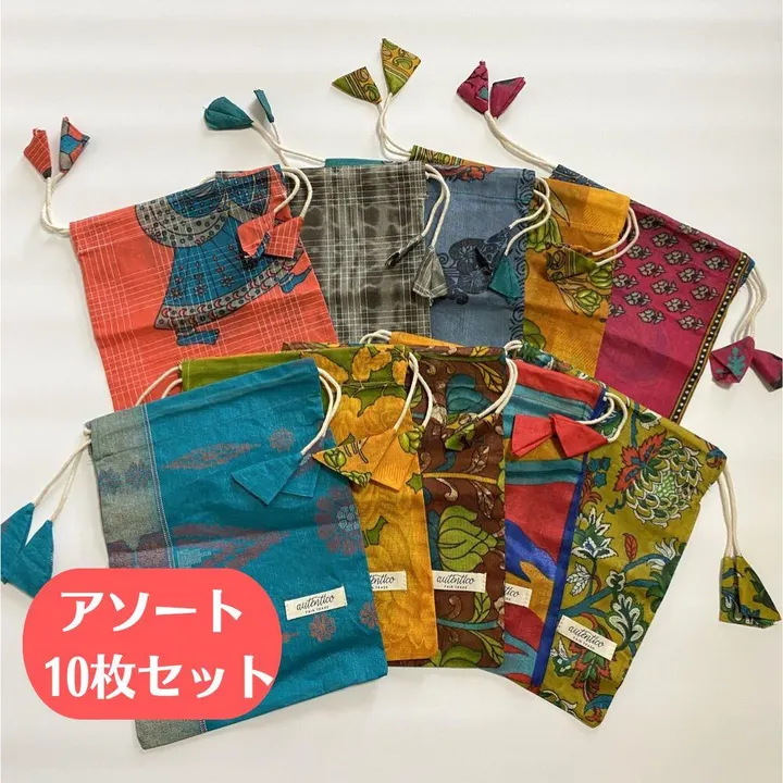 ”訳アリ”アップサイクルサリーの巾着袋(フェアトレード) アソート10枚セット