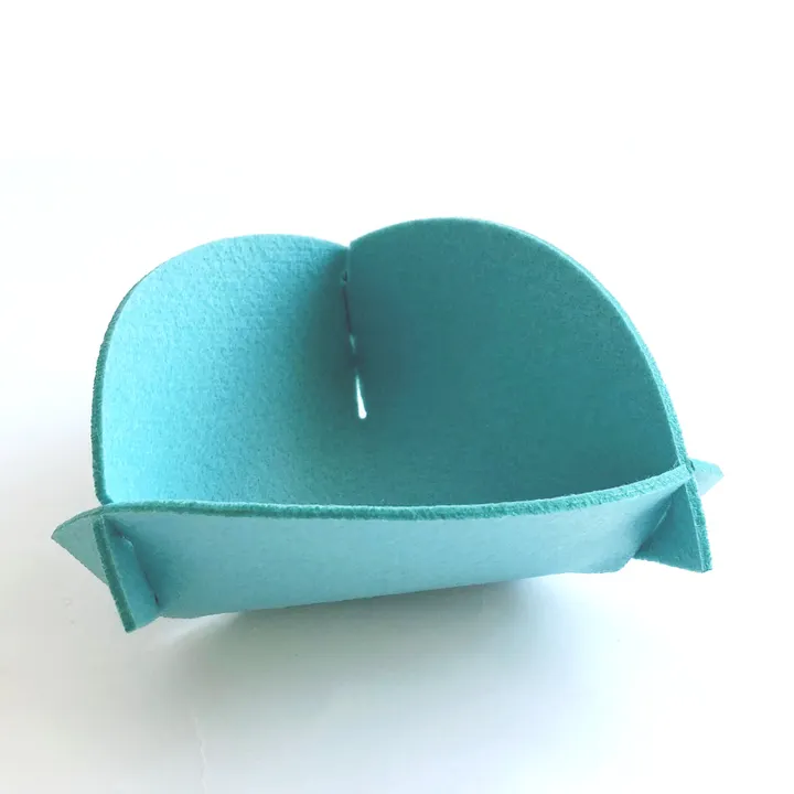 ふんわりとした〈小物入れ〉をデザインしました。3ヶ所の切り込みを差し込むだけで立体になる楽しいアイテムです。フェルトはモノにも人にも優しく、クリップ、ピン等の文具からアクセサリー、キャンディー等入れるもののアイデアが広がります。使い方はデスクトップ、テーブルウェア、リビングの小物入れとして、またお出かけに携帯すれば使用したいところで、大事なものの小物入れとして活躍しそうです。もちろんウォッシャブルフェルトを採用しており、汚れた時は洗濯可能です。ビビットなカラーはプレゼントにもおすすめです。