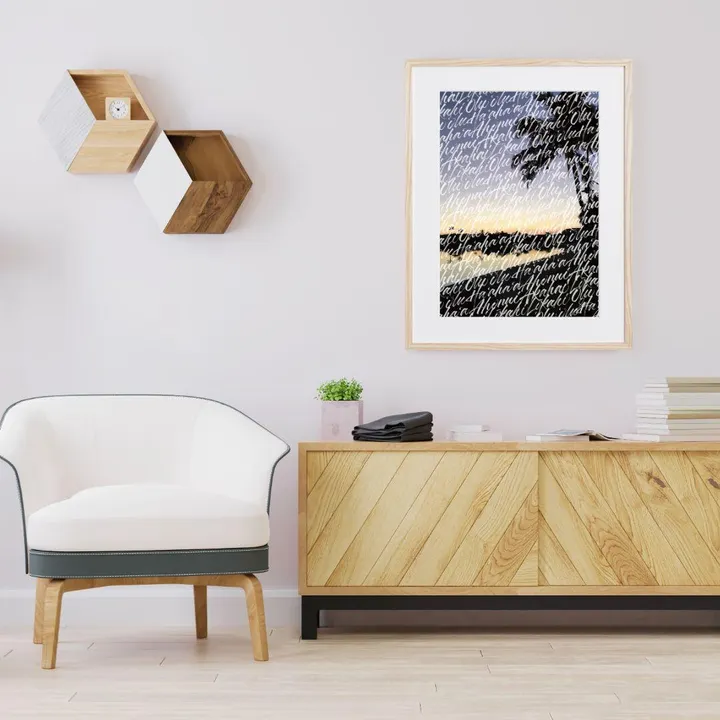 【現代アートポスター】ハワイ 風景景色 海岸 ビーチ ヤシの木 サンセット カリグラフィー A2(L) フレームセット:無垢 56.1×74.3cm