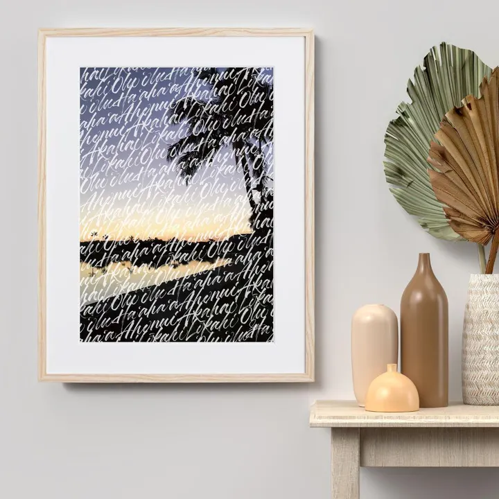 【現代アートポスター】ハワイ 風景景色 海岸 ビーチ ヤシの木 サンセット カリグラフィー A3(M) フレームセット:無垢 41.0×52.5cm