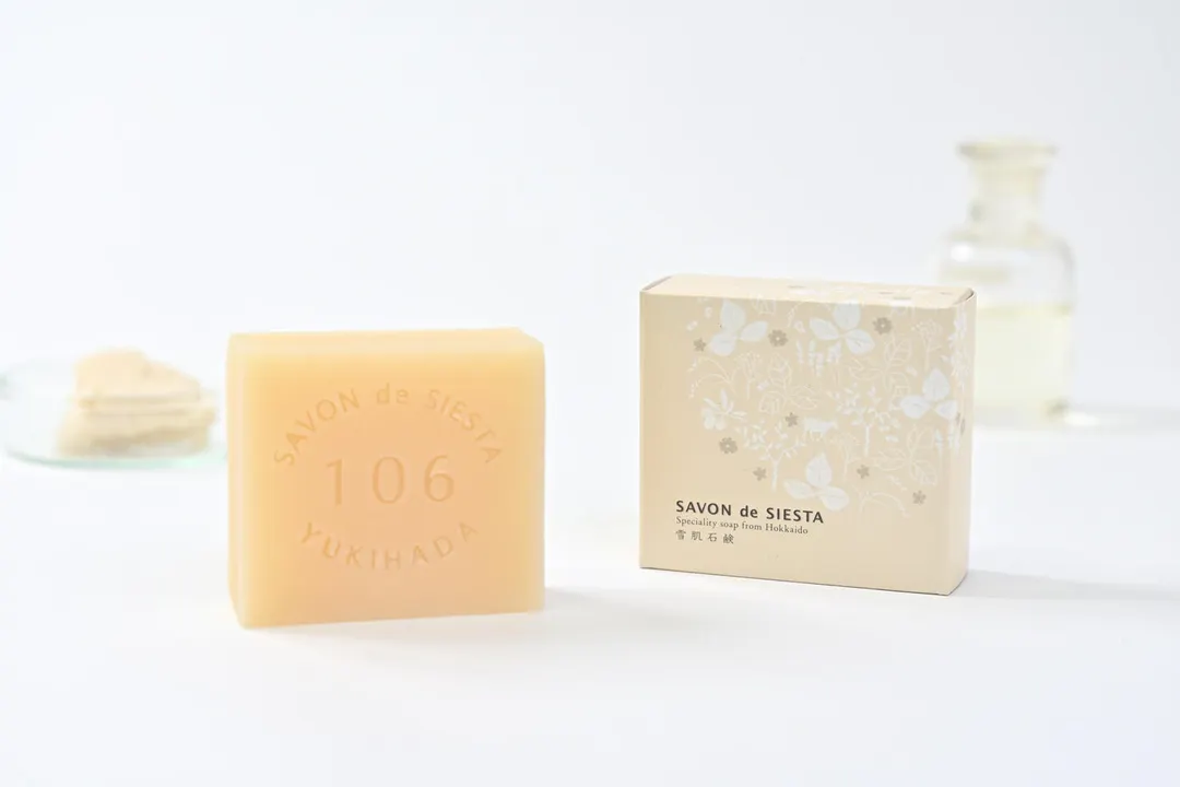 ●お肌のキメを整え、もちもち素肌になる お肌をしっとりスベスベにする、小樽・田中酒造の酒粕配合。深いリラックスを感じさせるラベンダー・ヒノキ・サンダルウッドをブレンドした香りが泡立てるたび、ふわっと広がる石鹸です。 ●酒粕は昔からの美肌素材 肌のキメを整え保湿効果のある酒粕は、日本では古くから美肌素材として知られています。 SAVON de SIESTAの『雪肌石鹸』には、北海道産米だけを使い丁寧な酒造りをしている、小樽の田中酒造の酒粕を使用しました。 築100年を超える建物をリノベーションして、酒造りの様子がいつでも見学できる酒蔵を作り、そこに併設した直営店で作り手が直接お客様に商品を販売する。そして、季節毎に酒蔵を使ったイベントを開催してお客様と楽しむ。主に地元小樽で消費する量だけを丁寧に作り、良いものを届けている。そんな田中酒造さんの姿勢に共感して、わたしたちの石鹸にも使わせていただいています。 その酒粕を加えた石鹸は、きめ細かでもっちりとした泡が気持ちよく、洗い上がりのもちもち素肌を実感いただけます。 ●深いリラックスを感じさせるアロマの香り ほんのり甘みを含んだ、落ち着いた木の香り。 古来から高級木材として神社仏閣などの神聖な建築にも重用されてきた檜。その香りは、リラックス効果が高く、自分らしさを取り戻す香りとして知られています。 落ち着いた檜の香りに、ほんのり甘く華やかなラベンダーと、ココロを静かに整えてくれるサンダルウッド(白檀)をブレンドして、静寂を味わうような『和』の香り付けをしました。 日々の暮らしの中で、ホッと一息、体の芯から深呼吸できるような香りをお楽しみください。 \お客様からの感想/ 檜の和の香りがとても落ち着きます。また、泡立ちがとても良く、耐久性のある泡が作れ、使っていてもへたることがありません。泡に顔を埋めると香りの良さと泡がクリーミーなのでとても癒やされ、洗い上がりもしっとりしています。 朝、洗顔すると夜の洗顔が待ち遠しいくらいです。