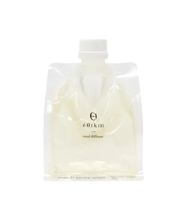 ウッドスタンドにリフィルをそのままセットして使う、éθIk(ə) エシカリードディフーザー、 こちらは付け替え用のリフィル単体の販売となっております。 別売りのリードディフューザーセットの液体が無くなりましたら、こちらのリフィルをウッドスタンドにセットしてご使用ください。 こちらのリフィルのみでは自立したご使用は出来ませんのでご注意ください。 別売りで替えのスティックもございます。 【ご使用方法】 別売りのスタンドにセットし、蓋を外してリードスティックを挿します。スティックが徐々にオイルを吸い上げて、香りが広がります。 リフィルの詰め替え時に液体をこぼしたりする心配が軽減され、ウッドスタンドはそのまま使用し続けられるのでゴミの量の軽減にも繋がります。 morningからmidnightまでの一日の時間の流れをイメージした4種類の香りです。 【香り】 ・morning sunlight(aroma_01) 落ち着いたアンバーをベースにジャスミンやシナモンなどの華やかで甘い香りをプラスし、気持ちの良い朝の日差しをイメージした香り。 ・afternoon moment(aroma_02) ブラックカラントやパイナップルの甘酸っぱい香りを濃厚なムスクの香りで包み込む、午後のひとときをイメージした香り。 ・sunset shadow(aroma_03) バニラの甘い香りを、ラベンダーとコリアンダーですっきりとまとめた、夕暮れをイメージした香り。 ・midnight relax(aroma_04) ミモザのフローラルな香りとオレンジブロッサムの爽やかな香りを甘く濃厚なバニラの香りでまとめた、真夜中のまどろみをイメージした香り。