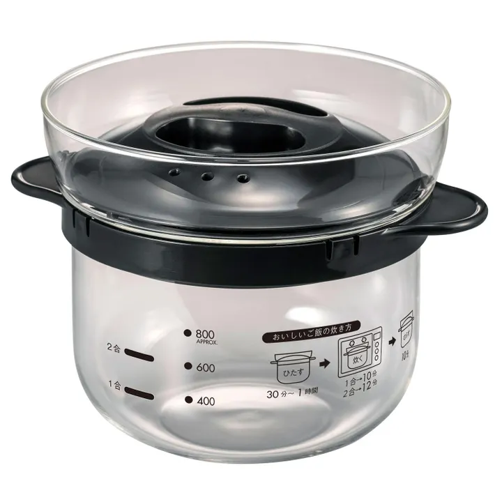 1~2 合のご飯が炊ける、電子レンジ用のご飯釜です。ご飯はもちろん、季節の炊き込みご飯もこれひとつで簡単調理できます。お米を水に浸し、電子レンジ10 分で炊き上がります。(1 合 600W の場合)