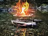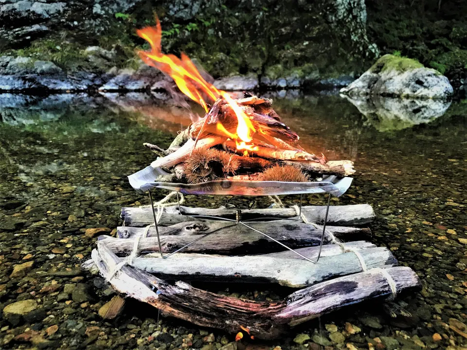 世界最軽量!65g!水に浮く焚き火台(流木の筏) オリジナルデザイン。 一、アップサイクル。 二、全て人力で製作。 三、創造的な再利用。 四、ウルトラライト。 五、自由な自然遊び。 を理念にoutdoor民藝品「UKIBI(浮火)」を製作しております。 「足るを知る」余計な機能や飾りは有りません。 直火の様な焚き火台。 焚き火台を眺めるより「焚き火」の魅力を。 焚き火台UKIBI(Sサイズ) 重量:約65gm(世界最軽量) 耐荷重:約3.5Kg 使用サイズ:約22×22㎝ H:約9㎝ 収納サイズ:28㎝×22㎝ 素材:ステンレス made in Japan ☆大地に優しく、 熱反射板として家庭用アルミホイルを挟めば、二段の空気層とで輻射熱を三重ブロック。 (灰はアルミホイルに包んでゴミ箱に) ☆地球に優しく、 自転車の廃棄スペアスポークの再利用。 ☆身体に優しく、 バックパックに忍ばせて、 山に担ぎ上げても超軽量。 ☆こころに優しく、 焚き火時間をお楽しみ下さい。 ☆流木で組んだ筏に乗せ静水に浮かべれば、 逆さ焚き火が神秘的です。 *ステンレスメッシュは折り畳んだり細く丸めたり出来ますが、極端に寿命が縮まります。 ケースに入れてそのままか、緩く丸めて持ち運び下さい。 *組み立て動画をYouTubeにアップしております。 「焚き火台UKIBI組み立て」で検索下さい。