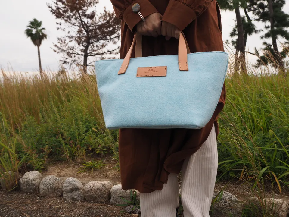 [recycle Felt = 再生フェルト] × [genuine Leather = 国産本革] ペットボトルを回収してつくられた独自開発の再生フェルト、 つかいこむほどに経年変化する国産の本ヌメ革、 普段は交わりあうことのないふたつの“環境素材”。 味わい、温かみ、軽さ、丈夫さ、弾力性、耐久性、防虫性、形状安定性… お互いの素材の良さを引き出し、上手く調和させることで、オン・オフを問わず、 愛着をもって長く使っていただける新しいスタイルのアップサイクルプロダクツ。 FelLe®(フェルレ)は、そんな想いを込めた新しいエコプロダクトブランドです。 ――― 商品説明 ――― 広幅底のスペースを確保した軽量ながらもしっかり形状のランチトート ・広幅の底板を設けた週能力は使いやすさ抜群のサイズ感です。 ・厚手の再生フェルト素材で中身を守る機能性に加え、大きさの割に軽量です。 ・小物入れに便利な内ポケットと、そこ鋲も設けています。 ・開口部は、使い勝手に応じて便利な2段階のホック仕様です。 ・持ち手は厚口4mmのヌメ革を使用し、経年変化を味わえます。 ・フェルト生地は、あえてムラ感を出したスモーキーカラーとなる特殊製造オリジナル生地。 素材: 再生ポリエステル 本革 サイズ: 約W380×H210×D200㎜(袋部) (持ち手立ち上がり:約120㎜) 重さ: 約480g カラー展開: 9色 ――― お買い上げ前にお読みください ――― ・本革を使用している部分には、本革特有の多少の表情のムラや傷、手触りの違い等がありますが、天然本革の一般的な特長であり損傷ではありません。 また、日光や外気や使用時の手触り等により、経年変化を起こし、色が濃くなることがあります。 ・生地のフェルトの素材の性質上、摩擦により毛玉ができることがありますが、ハサミなどでカットしてください。