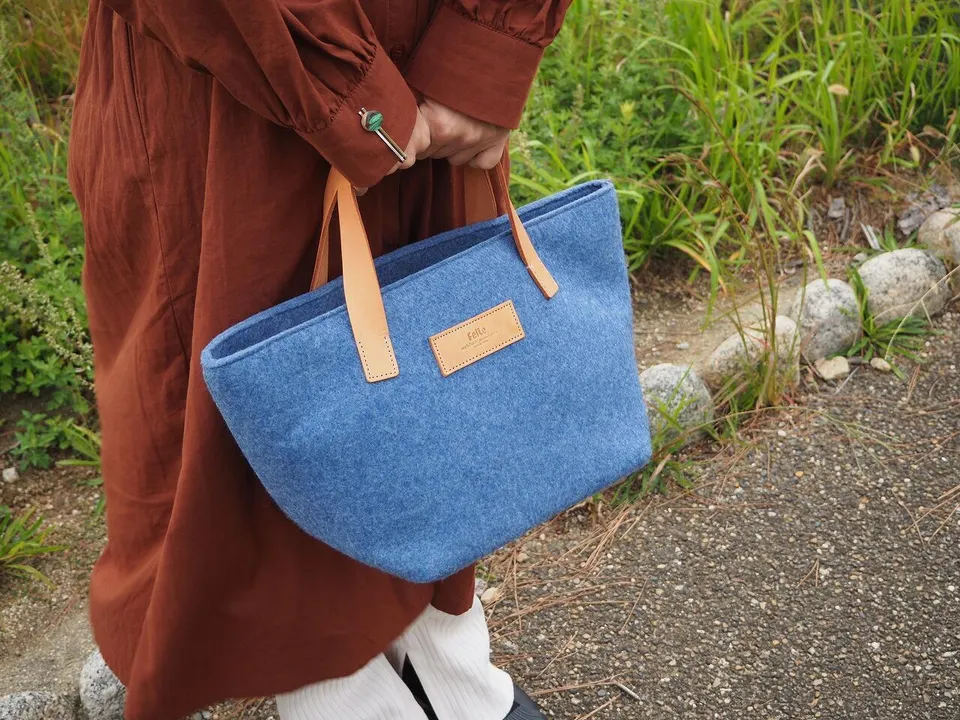 [recycle Felt = 再生フェルト] × [genuine Leather = 国産本革] ペットボトルを回収してつくられた独自開発の再生フェルト、 つかいこむほどに経年変化する国産の本ヌメ革、 普段は交わりあうことのないふたつの“環境素材”。 味わい、温かみ、軽さ、丈夫さ、弾力性、耐久性、防虫性、形状安定性… お互いの素材の良さを引き出し、上手く調和させることで、オン・オフを問わず、 愛着をもって長く使っていただける新しいスタイルのアップサイクルプロダクツ。 FelLe®(フェルレ)は、そんな想いを込めた新しいエコプロダクトブランドです。 ――― 商品説明 ――― 広幅底のスペースを確保した軽量ながらもしっかり形状のランチトート ・広幅の底板を設けた週能力は使いやすさ抜群のサイズ感です。 ・厚手の再生フェルト素材で中身を守る機能性に加え、大きさの割に軽量です。 ・小物入れに便利な内ポケットと、そこ鋲も設けています。 ・開口部は、使い勝手に応じて便利な2段階のホック仕様です。 ・持ち手は厚口4mmのヌメ革を使用し、経年変化を味わえます。 ・フェルト生地は、あえてムラ感を出したスモーキーカラーとなる特殊製造オリジナル生地。 素材: 再生ポリエステル 本革 サイズ: 約W380×H210×D200㎜(袋部) (持ち手立ち上がり:約120㎜) 重さ: 約480g カラー展開: 9色 ――― お買い上げ前にお読みください ――― ・本革を使用している部分には、本革特有の多少の表情のムラや傷、手触りの違い等がありますが、天然本革の一般的な特長であり損傷ではありません。 また、日光や外気や使用時の手触り等により、経年変化を起こし、色が濃くなることがあります。 ・生地のフェルトの素材の性質上、摩擦により毛玉ができることがありますが、ハサミなどでカットしてください。