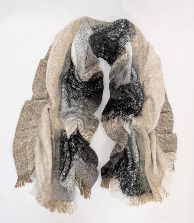 フランスの織物をパッチワークして作られた、ストールにもなるケープ風羽織です。 シャーリング加工により立体感があり、ボタンが2つついていて自由にスタイリングできます。 モヘヤを使用した三者混の生地は軽量ながら空気を含んで暖かいです。