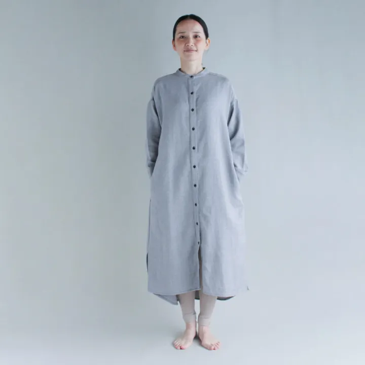 みんなにやさしく心地よいパジャマを作りたい。 このパジャマは、今治のタオル織機で織られた生地で、タオルのループを無くしてフラットに織った生地を使用しています。 タオルに使える生地なので吸水性がよく、とてもやわらかく、通気性にも優れています。 ワッフルのような独特 の凹凸のある、さわやかな質感と、洗いざらしでも様になる風合いです。洗っていくうちに柔らかく肌に馴染んでいきます。 首回りがすっきり見えるバンドカラーやサイドスリットがシルエットを引きしめ、大人っぽく洗練された印象に。 前ボタンタイプで脱ぎ着しやすいので、授乳の時にもおすすめです。レギンスとあわせてワンマイルウェアーとしても使えるワンピースです。