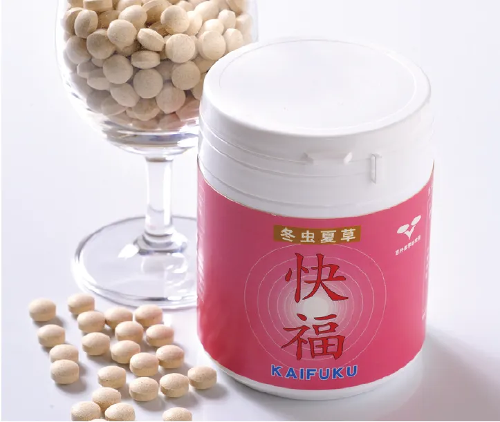 井菌学研究所のタブレットタイプ! 「快福」は、配合比率は冬虫夏草分粉末が40%、霊芝分粉末が30%、椎茸分粉末が30%の配合で粉末をタブレットタイプに加工した健康食品です。 全体的なバランスの良い商品です。 主に肺や血圧、花粉症等のアレルギーをお持ちの方に人気の商品です。 1.玄米のもつ豊富なビタミンB群をギュッと!! 脳や神経、皮膚などを健康に保つビタミンB群。ビタミンが不足するとエネルギーが不足し、ストレスに弱い体になってしまいます。元気に欠かせないビタミンB群を効果的に摂ることが出来ます。 2.シイタケの力で豊富なビタミンDをギュッと!! 骨を作るためにはカルシウムだけでは足りません。腸からカルシウムを摂取するためには、ビタミンDが欠かせません。骨粗鬆症が心配な方は、ビタミンDを取るのがお勧めです。 3.霊芝の力でβグルカン・カリウムをギュッと!! 花粉症や、PM2.5などのアレルゲンからアレルギーに苦しむ人も少なくありません。霊芝に含まれるβグルカンは免疫力の調整作用があり、アレルギー抑制に効果を発揮します。 カリウムは、血圧低下に大きな役目を果たします。 4.冬虫夏草の力で18種類のアミノ酸をギュッと!! 冬虫夏草は中国手古来より、神秘のキノコとして重宝されてきました。 老化予防、疲労回復、低下した免疫力の向上が期待できます。細胞の持つ本来の機能を取り戻したい方にお勧めです。 仕込みに2ヶ月、培養に3ヶ月、乾燥に3週間、製品化に1ヶ月と長い時間をかけ、大切に育てている商品です。そのため年間に500個しか製造できないため、時期によってはお待ちいただいている商品です。気になる方はお早めにどうぞ。 バランスのとれた効能をお求めの方に、「快福」をおすすめ致します。