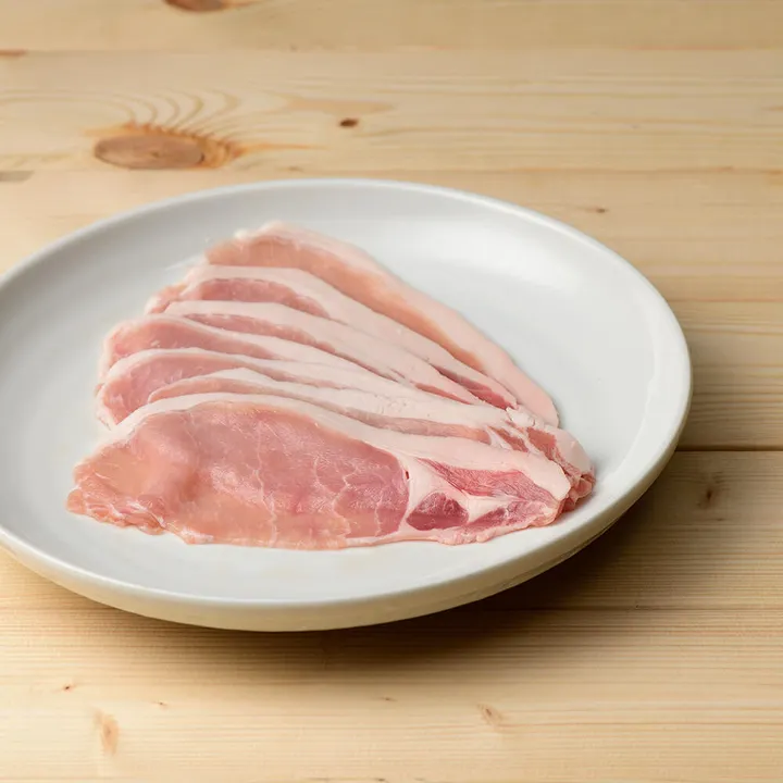 本品は冷凍品です (各注文の商品発送時に送料を設定) ※配送・送料の下部「配送・送料に関する補足」をご確認ください -------- 「房総もち豚」 クセがなく、脂に甘みがあり、 *「塩だけで十分おいしい」*と感じていただける市場流通の少ない上質な豚肉。 一農場限定・一頭買い。千葉産直サービスの自社工場で最終加工。 ◇ 生産地 千葉県市原市 ㈲比留川畜産 ◇ 加工者 千葉県千葉市 ㈱千葉産直サービス その脂はクセがなく、甘味さえ感じる。 塩味だけで十分においしいほど味わい深い。 豚肉が苦手な人にも「この豚肉なら食べられる!」と喜ばれております。 クセや臭みが無く甘味のある脂身は「食べる脂肪」としてもおいしいので料理に活かしたくなる良質なもの。 また、鮮やかな綺麗な色と、きめ細かいもちもちとした肉質と上質な旨味のある赤身も特徴です。 < 豚肉のおいしさが分かるロース肉 > 豚ロースは肉質が柔らかく豚肉を代表する部位。 クセのない甘みは良質な房総もち豚ならでは。 生姜焼きや野菜の肉巻き、ミルフィーユかつなどにどうぞ。 豚肉本来の甘みと旨味を、ぜひご堪能ください。 房総もち豚が「選ばれる理由」 ● 一農場限定。家族経営だから行き届く目 規模が大きくなると、生産の効率化や作業の合理性が優先されてしまいますが、当社は比留川さん(市原市・比留川畜産)一農場に限定。小規模だからこそ行き届く目が生む品質があります。作り手と加工者、消費者の持続可能な健全な営みを大切にしています。 ● 目配り、気配り、愛情かけて育てる 「彼ら(豚)の身になって」ストレスを与えない様に日々注意深く観察し、豚に接しています。 豚と向き合う姿は、まるで会話をしているかのような、生産者の比留川さん。生き物としての豚への接し方を何よりも大切にされています。 ● 約80日齢以降、飼料には薬剤不使用 子豚時、病気予防の抗生物質以外、成長段階の約80日以降は抗生物質は一切飼料に加えません。またEM菌やハーブ等を加えた独自のこだわり飼料で約190日かけて育てています。 ● 一頭買い、自社工場で最終加工 比留川さんが大切に育てられた豚を、当社が一頭単位で責任仕入れ。 千葉産直サービスの自社工場で品質を見極めながら最終加工してお届けします。顔の見える関係だからこそ守れる品質があります。