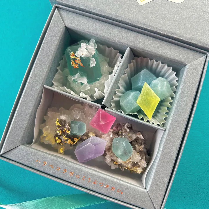 大好きな宝石の形を和菓子琥珀糖に落とし込みました。手切りの技、造形力に磨きをかけ、手に取った方に感動を与えるデザインを試行錯誤しました。手仕事の輝きを世界に。