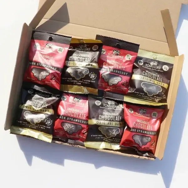 【溶けない!常温流通可能】 トム&ルークの人気フレーバー<オリジナルダーク33g×4個、ストロベリー33g×4個>が入ったアソートボックスセット! プレゼントや2種類入っているのでお試しとしても最適! 🔳<ヴィーガン対応>罪悪感にサヨウナラ!新感覚のギルトフリーチョコレート。 🔳デーツとナッツから作られたチョコレートボール。 🔳グルテンフリー、精製砂糖不使用、乳製品不使用、卵不使用、ヴィーガンでヘルシーなおやつとしてお召し上がりいただけます。 🔳精製砂糖不使用でドライフルーツのデーツ本来の甘さをいかし、食べ応え抜群です。 【トム&ルークとは?】 ニュージーランドで大人気のパーソナルトレーナー「トム」と、客足の絶えないレストランのシェフ「ルーク」が健康と美味しさを形に変えた実力派スイーツです。 【健康と美味しさをカタチに】 甘いものは食べたいけど、砂糖はできれば摂りたくない!そんな願いをドライデーツの甘さを最大限に生かして実現しました。 【まるで本物のチョコレート?!】 カカオも使用しているためチョコレートのような感覚で召し上がれます。 【健康に欠かせないアーモンド】 ビタミンE、食物繊維、ミネラルが豊富に含まれるアーモンドを、ドライデーツと一緒に混ぜて食べやすくしました。 (対象商品:オリジナルダーク33g、ダークストロベリー33gに使用) 【こんな時にオススメ】 🔳ダイエット中で、砂糖を使ったスイーツを控えている時 🔳トレーニングの栄養補給 🔳小腹が空いた時 🔳朝ごはんに十分な時間が取れない時 🔳コーヒータイムに 🔳ワインのお供に 🔳ハイキングなどお出かけ時に 🔳忙しい時 🔳食べているときに音が気にならないので、オフィスで仕事中にもサクッと食べられる