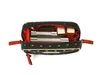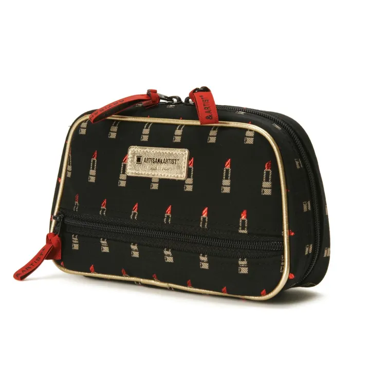 ブラックカラーの上に輝く、メタリックなラメ糸で織られた真紅のリップスティックとパイピングのゴールドカラーのアクセントが、何とも言えない大人可愛いデザインです。 メインファスナーが底まで開く作りで、中身を一目で確認でき、出し入れがスムーズ。両側に笹マチがついているので、中身が落ちる心配もありません。 アイテムを効率良く収納するために、ポケットの配置にもこだわりました。右側にはリップ類、左側にはコンパクトなどを入れることで、ポーチの中の限られたスペースを有効活用できます。 ポーチ外側背面にはティッシュケース付き。ティッシュケースの口元を波型にすることで中身が取り出しやすくなっています。使用しないときは波型部分を中にしまうことで、見た目もスッキリとスマートになります。