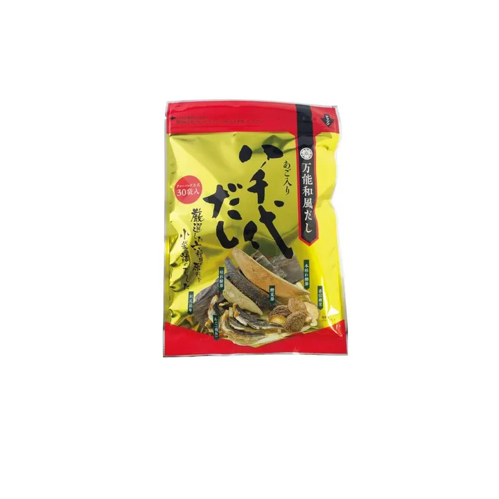 「八千代だし」の原料には、料亭御用達の本枯れ鰹節と荒節をベースに、コクがあり濃厚な味わいの枯れ鯖節、濃厚で澄んだだしが取れる利尻昆布、風味豊かで香り高い香信椎茸と、プロ好みの本格派を揃えました。 さらに鳥取名産「あご(飛魚)」を加えることで旨味に上品さが増します。 これらを使いやすい小袋にギュッと詰めました。家庭で揃えるには大変な5種の原料を小袋に詰めた「八千代だし」なら、誰でも簡単に、しかもプロ級のだしが取れてしまいます。 原材料名:食塩(国内製造)、風味原料(鰹節粉末、鯖節粉末、飛魚粉末、昆布粉末、椎茸粉末)、砂糖、粉末醤油、食用植物油脂/調味料(アミノ酸等)、(一部に小麦・さば・大豆を含む) 賞味期限:製造日より547日 保存方法:直射日光・高温多湿な場所を避けて常温で保存してください。 注意事項:開封後は湿気が入らぬように必ずチャックをしめて冷蔵庫で保存し、なるべくお早目にお使いください。 だしパックを破ってご使用の際には、まれに小骨が混入していることがありますのでご注意ください。 本品製造工場では、えび、かに、卵、乳成分を含む製品を製造しています。